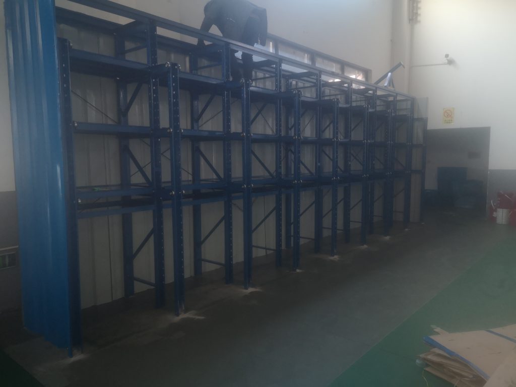 此款模具架為帶封板式的全抽模具架,和之前不同的是,這次的封板是帶波浪形狀的,客戶為了實現防塵和客戶參觀以及其他安全問題的考慮,我們一同商定,所有的封板使用帶波浪的彩鋼板,既可以滿足功能需求,又節約一部分開支;